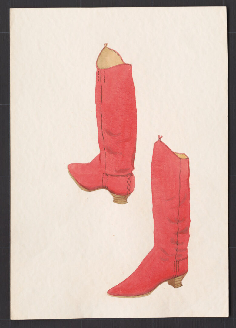Ženské čižmy, Veľký Blh, druhá polovica 19. storočia. Čižmy sú ušité z jemnej červenej teľacej kože – kordovánu. Majú tvrdé sáry s dvoma švíkmi po stranách a s vyšším, tvarovaným opätkom. Červená farba naznačuje, že boli určené pre slobodné dievča alebo mladú ženu. Staršie ženy nosili čierne čižmy. Čižmy patrili k sviatočnému odevu. V lete ženy zvyčajne chodili bosé. V čase žatvy si obúvali krpce zhotovené z kožených sár starých čižiem. Vo všedné dni v zime a na menej sviatočné príležitosti nosili vysoké šnurovacie topánky. Na prelome 19. a 20. storočia prišli do módy kožené pantofle (papuče) z čiernej kože, zdobené aplikáciami z červenej irchy a farebným strojovým štepovaním.