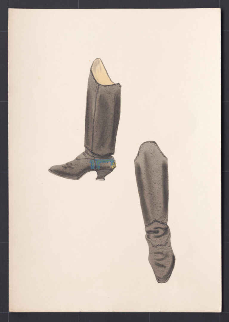 Ženské čižmy, Opatová, začiatok 20. storočia. Čižmy sú ušité z jemnej čiernej kože. Majú tvrdé sáry s dvomi švíkmi na boku a vyšší, tvarovaný opätok. Na pätách sú zdobené farebným strojovým štepovaním a nabitými ozdobnými kovovými cvočkami. Charakteristickým znakom ženských čižiem je oblúkovito vykrojený horný okraj sár. Čižmy patrili k sviatočnému odevu. V polovici 20. storočia začali ženy nosiť čižmy s nízkym opätkom a tiež priemyselne vyrábané druhy obuvi.
