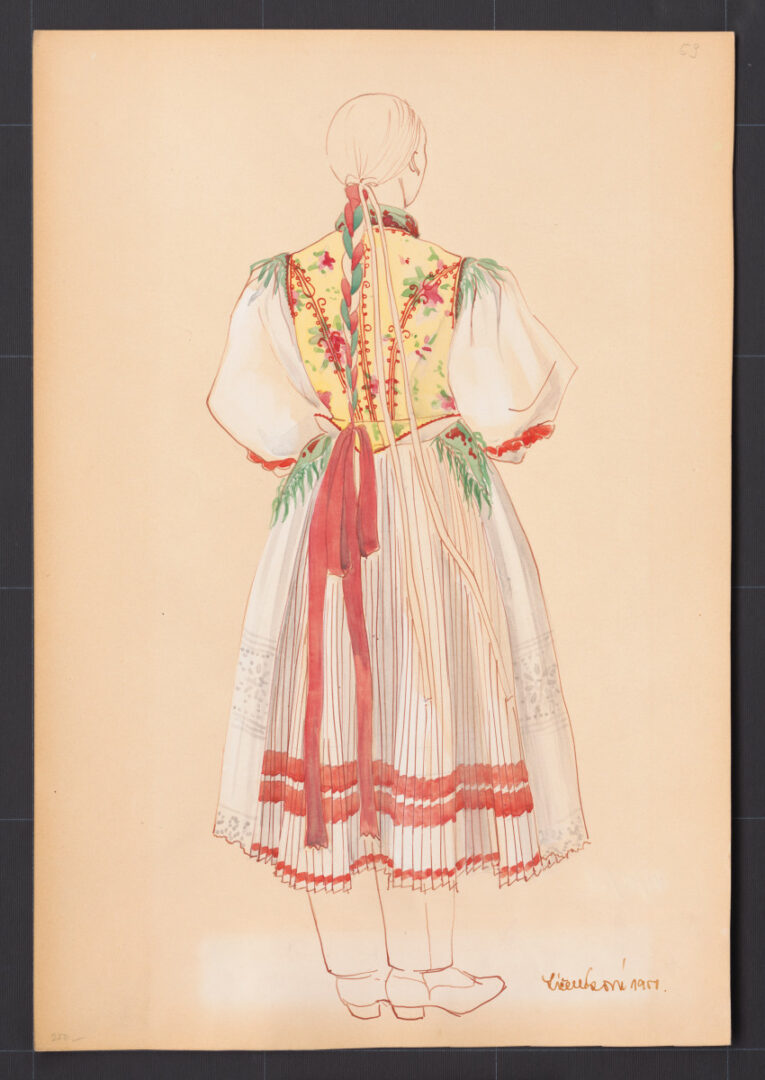 Sviatočný odev slobodného dievčaťa. Prvá štvrtina 20. storočia. Dievča má oblečený plátenný rubáš (bendľacku), rukávce z domáceho kepra – drilichu, žltý kašmírový živôtik, bielu sukňu s červenými pásmi a bielu plátennú širokú zásteru (fartuch). Pod živôtikom má na hrdle a krížom cez hruď založenú kašmírovú šatku so strapcami na okrajoch. Takto sa obliekali slobodné dievčatá na veľké cirkevné sviatky.