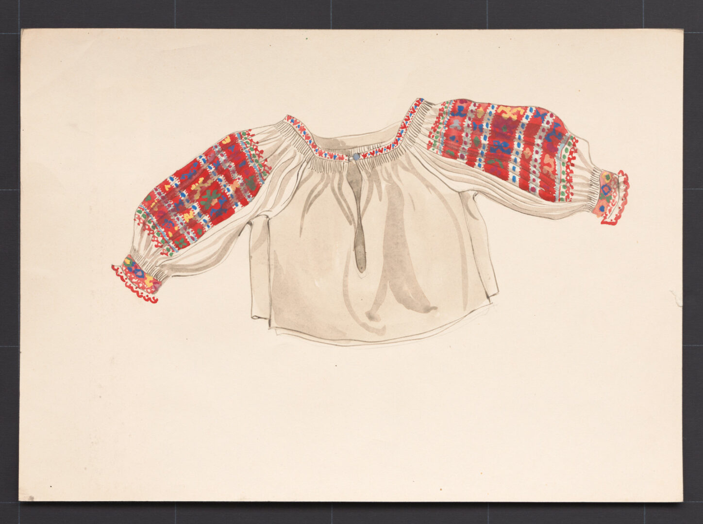 Rukávce pre slobodné dievča alebo mladú ženu, Ábelová, okolo roku 1925. Rukávce sú z hrubšej bavlnenej činovate. Rukávce tohto druhu, hranavé, boli oproti iným teplejšie, a preto sa nosili najmä na jar a v jeseni. Rukávy sú prišité bokom a zdobené ozdobným vytkávaním z červenej nesúkanej bavlnenej priadze a z pestrej vlnenej priadze. Okolo roku 1900 boli považované za najparádnejšie a najcennejšie.