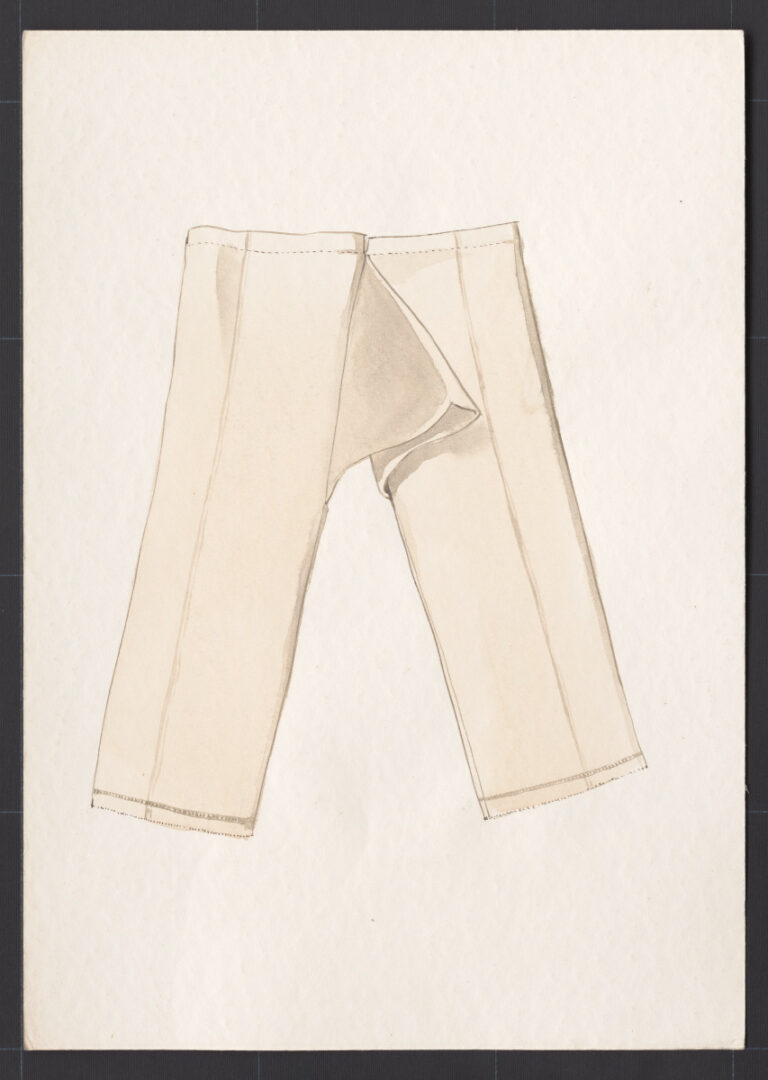 Gate, Skýcov, začiatok 20. storočia. Gate (gace) sú ušité z troch pôl domáceho konopného plátna, každá gaťa z pol druha poly, s veľkým štvorcovým klinom v rozkroku. Siahajú po členky. Materiál gatí, konopné plátno, dokladá, že boli určené na nosenie vo všedné dni. Na sviatočné dni sa gate šili z hrubšieho bavlneného plátna. Gate sa nosili len v lete. Ku gatiam si muži opásavali úzku zásteru – vo všedné dni z konopného plátna, vo sviatočné dni z čierneho glotu. V zime sa gate obliekali pod súkenné nohavice.