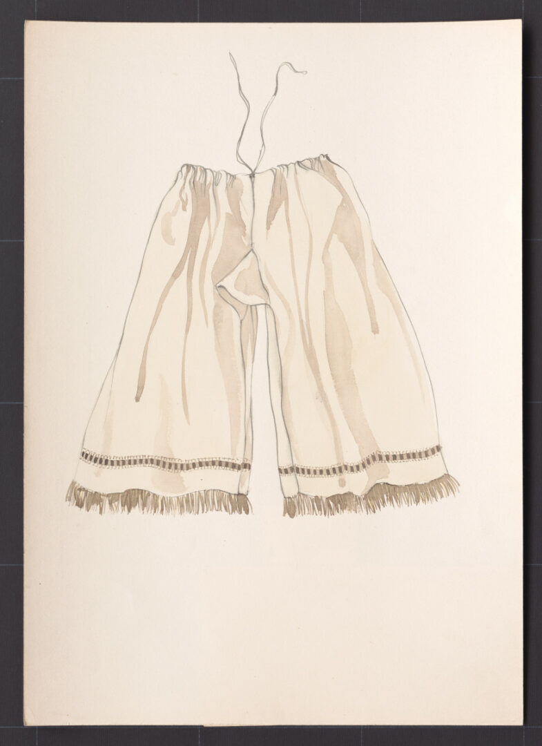 Gate, Poniky, prvá štvrtina 20. storočia. Gate (gaty) sú ušité zo štyroch pôl domáceho konopného plátna, každá gaťa z dvoch pôl. Spodný okraj je podšitý a vystrapkaný. Vystrapkanie malo chrániť spodný okraj pred predratím. Gate sa v lete nosili ako vrchný odev a v zime sa obliekali pod súkenné nohavice. Na všedné dni boli z domáceho konopného alebo polokonopného plátna a bez výšivky nad spodným okrajom. Sviatočné gate sa šili nielen z konopného, ale aj z bavlneného plátna. Vždy mali nad spodným okrajom pásik výšivky. Malí chlapci mali gate ušité z dvoch pôl plátna. Široké gate začali nosiť až vo veku 14-15 rokov. V priebehu prvej polovice 20. storočia sa gate prestali nosiť.