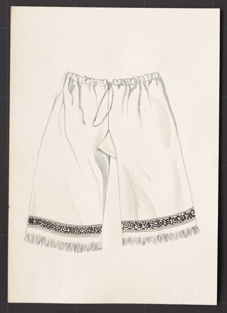 Gate, Žakýl, prvá štvrtina 20. storočia. Gate rovného strihu sú ušité zo štyroch pôl domáceho bavlneného plátna. Siahajú do polovice lýtok. Širší pás čiernej výšivky nad vystrapkaným spodným okrajom napovedá, že boli určené pre mládenca alebo mladého muža na sviatočné dni. Na gatiach pre starších mužov bola výšivka podstatne skromnejšia. Vo všedné dni, najmä v 19. storočí, sa nosili gate z konopného plátna. Plátenné gate sa nosili v lete. V zime sa obliekali pod súkenné nohavice.
