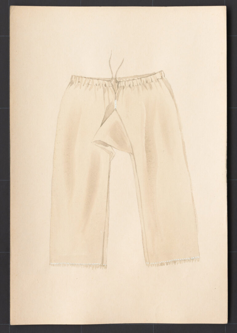Gate, Lubina, začiatok 20. storočia. Gate (gace) sú ušité z dvoch pôl domáceho konopného plátna. Siahajú takmer po členky. Spodný okraj je vystrapkaný, čo ho chránilo pred zodratím. V letnom období gate tvorili súčasť vrchného oblečenia vo všedné aj sviatočné dni. V zimnom období sa nosili ako spodné oblečenie pod súkenné nohavice.