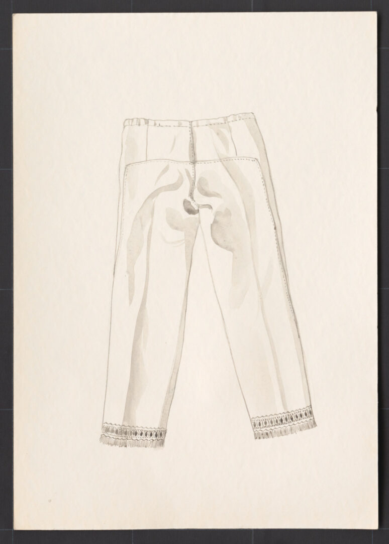 Mužské plátenné nohavice, Čičmany, druhá štvrtina 20. storočia. Nohavice na všedné dni sa šili z hrubšieho domáceho ľanového plátna, na sviatočné dni boli okrem ľanového plátna aj z bavlneného alebo ľanovo-bavlneného plátna. Strihom sa neodlišovali od súkenných nohavíc. V páse mali jeden rozparok. Spodný okraj nohavíc bol zdobený pásikom bielej výšivky a vystrapkaný. Na všedných nohaviciach bola výšivka užšia a na sviatočných širšia. Plátenné nohavice sa nosili len v lete.