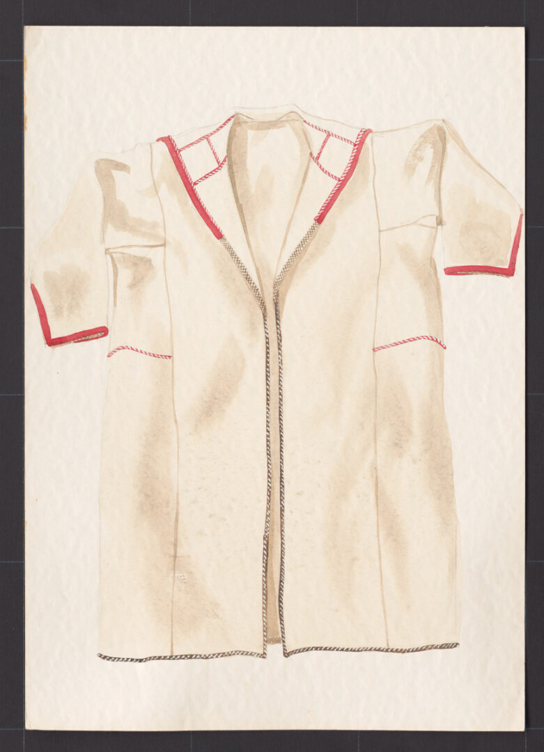 Halena, Studienka, začiatok 20. storočia. Halena (halina) je ušitá z jemného továrenského súkna, ktoré sa kupovalo v Malackách. Má rovný strih, siaha takmer po členky. Charakteristickým znakom haleny je veľký obdĺžnikový golier. Okraje goliera a rukávov sú lemované pásikmi červeného súkna. Vo sviatočné dni sa halena nosila na kabátiku len prehodená cez plecia, neobliekala sa do rukávov. Do rukávov sa obliekala iba pri práci, vtedy sa prepásala remeňom.