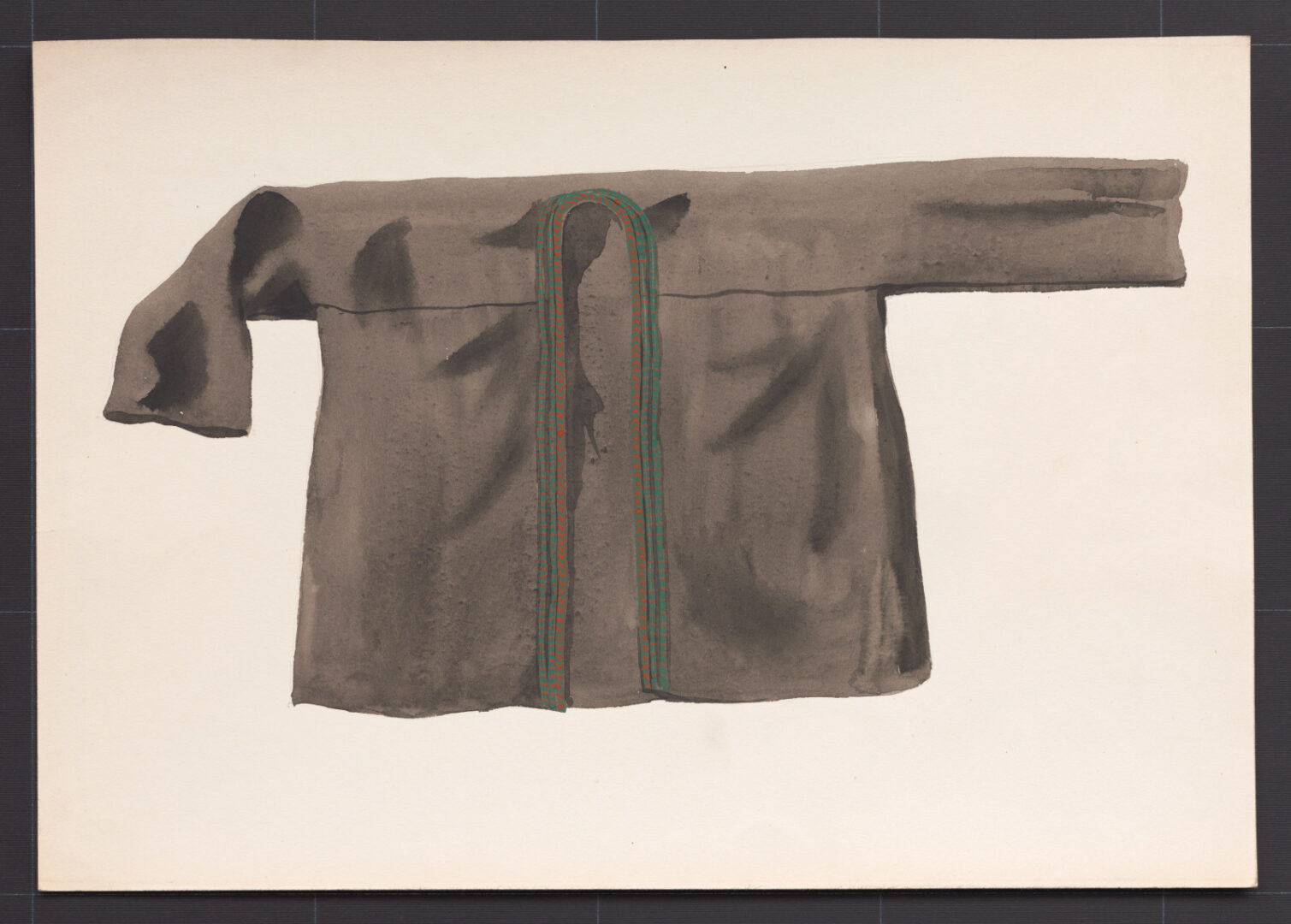 Mužská huňa, Horný Vadičov, prvá štvrtina 20. storočia. Huňa je ušitá z tmavohnedého hrubého domáceho súkna. Charakteristickým znakom je jednoduchý rovný strih s jedným švíkom naprieč hruďou, ktorým sú zošité aj rukávy. Okraje hune zdobia našité hrubé vlnené pletence zo zelenej a z červenej vlny. Huňa sa zapínala na remeň s prackou. Nosila sa najmä v chladnom období vo všedné aj sviatočné dni – vo všedné dni oblečená do rukávov, vo sviatočné len prehodená cez plecia. Patrila tiež k obradovému odevu ženícha, ktorý ju mal prehodenú cez plecia aj v lete. Hune sa prestali nosiť po prvej svetovej vojne.