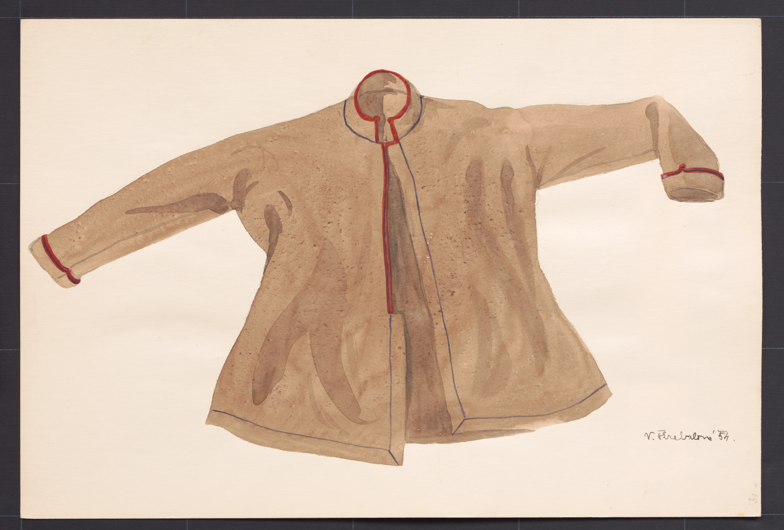 Mužská kabanica, Suchá Hora, prvá štvrtina 20. storočia. Kabanica (cuska) je ušitá z hrubého domáceho hnedého súkna. Strihaná je do pása a v bokoch krídlovito rozšírená klinmi. Siaha do výšky bokov. Okraje nízkeho stojatého goliera, časť predných dielov a rukávy lemuje pásik tenkého červeného súkna, pod ktorým je vtiahnutá hrubá vlnená šnúra. Kabanica sa nosila na kožušteku, prehodená cez plecia. Len v prípade tuhej zimy sa obliekla do rukávov. Bola povinnou súčasťou svadobného odevu ženícha.