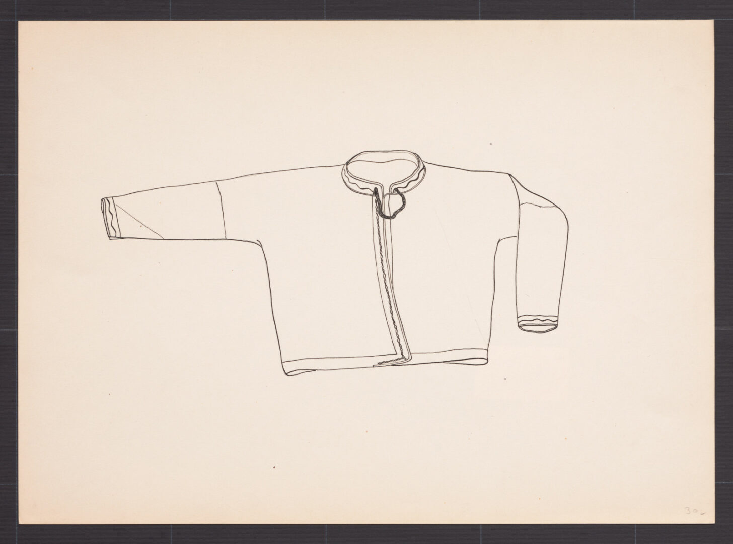 Mužská súkenná huňa, zv. „kabanica“, biela s červeným súkenným lemovaním. Štepené je prevedené lerú niťou Dačov Lom, okres Krupina