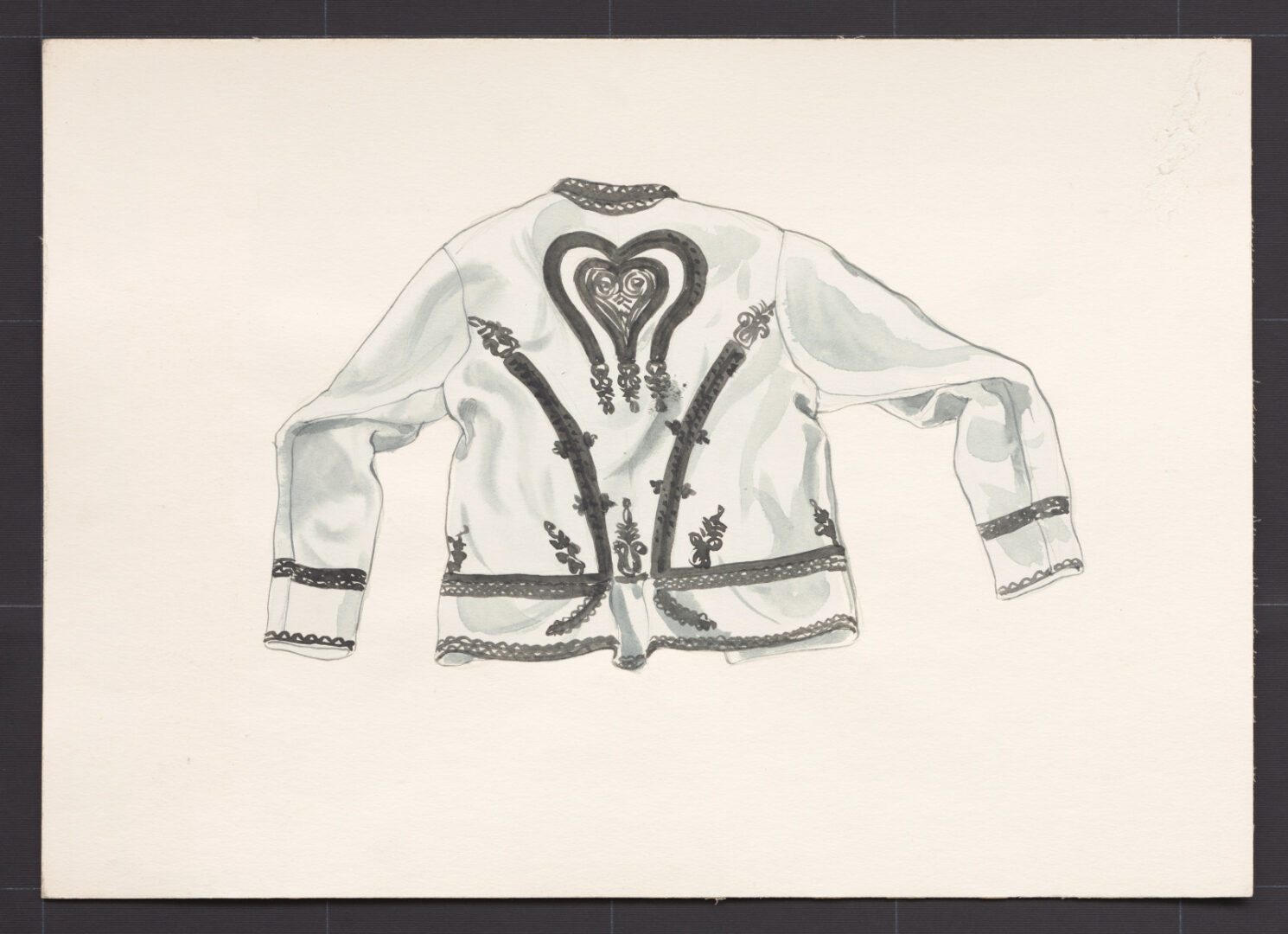 Mužský kabátik pre slobodného mládenca, Čierne nad Topľou, začiatok 20. storočia. Kabátik (šnurkovaná kikľa) je ušitý z bieleho bavlneného kepra (drilichu). Strihaný je do pása, vzadu s malým šosíkom. Rukávy sú krojené a mierne zúžené. Má nízky stojatý golier a zapína sa na veľký počet drobných gombíkov. Výzdoba kabátika je z užšej a zo širšej harasovej šnúrky. Na zadnom diele dominuje výzdoba v podobe srdcového motívu a dvoch pásov, ktoré zakrývajú chrbtové švíky. Kabátiky nosili mládenci i ženatí muži. Nosili sa najmä v lete vo všedné i sviatočné dni, rozlišovali sa však materiálom a výzdobou. Sviatočné kabátiky boli z bavlneného a na všedné dni z konopného drilichu. Pre mladých mužov boli zdobené šnurovaním alebo štepovaním, starší muži mali kabátiky bez výzdoby.