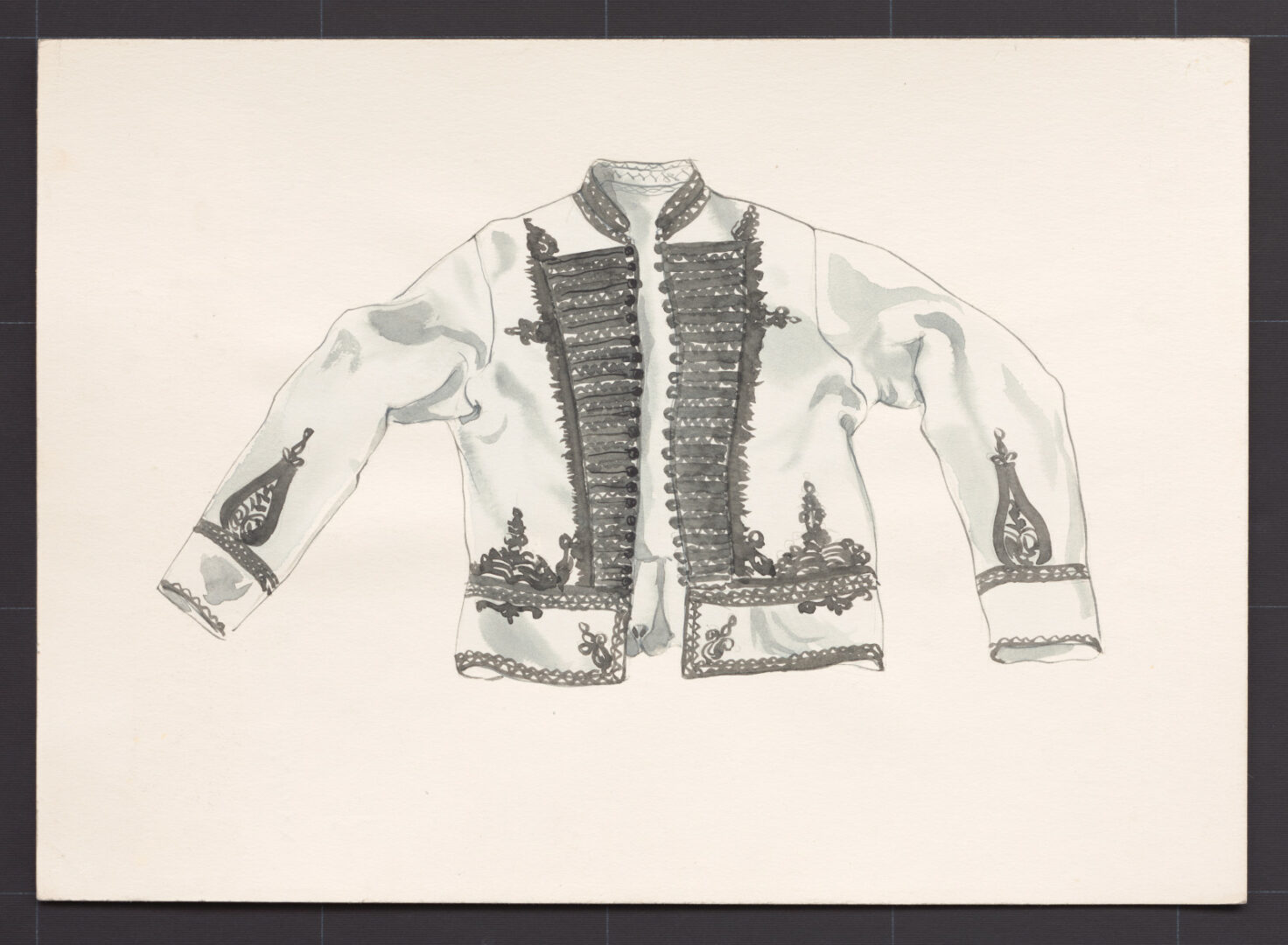 Mužský kabátik pre slobodného mládenca, Čierne nad Topľou, začiatok 20. storočia. Kabátik (šnurkovaná kikľa) je ušitý z bieleho bavlneného kepra (drilichu). Strihaný je do pása, vzadu s malým šosíkom. Rukávy sú krojené a mierne zúžené. Má nízky stojatý golier a zapína sa na veľký počet drobných gombíkov. Výzdoba kabátika je z užšej a zo širšej harasovej šnúrky. Na predných dieloch dominuje výzdoba pozdĺž zapínania. Kabátiky nosili mládenci i ženatí muži. Nosili sa najmä v lete vo všedné i sviatočné dni, rozlišovali sa však materiálom a výzdobou. Sviatočné kabátiky boli z bavlneného a na všedné dni z konopného drilichu. Pre mladých mužov boli zdobené šnurovaním alebo štepovaním, starší muži mali kabátiky bez výzdoby.