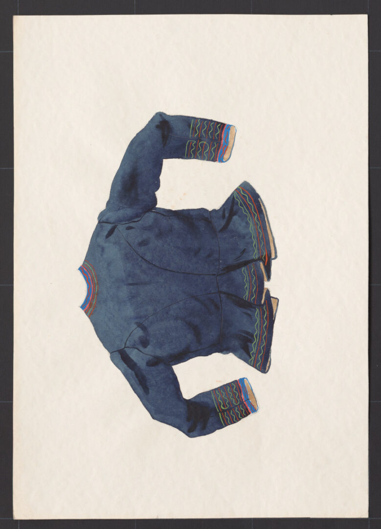Ženský kabátik, Jalovec, koniec 19. storočia. Kabátik (kanderka) je ušitý z jemného továrenského súkna tmavomodrej farby, podšitý je barchetom a vatelínom. Na podšívku sa zvyčajne používal barchet s hnedo-oranžovým károvaným vzorom. Kabátik je strihaný do pása, siaha niečo niže pása. Kabátik patril k všedným aj sviatočným odevným súčiastkam. Vo všedné sa obliekali obnosené kabátiky. Koncom 19. storočia nosili tieto kabátiky už len vydaté ženy. V tom istom období začali slobodné dievčatá namiesto nich nosiť blúzy, kacabajky.