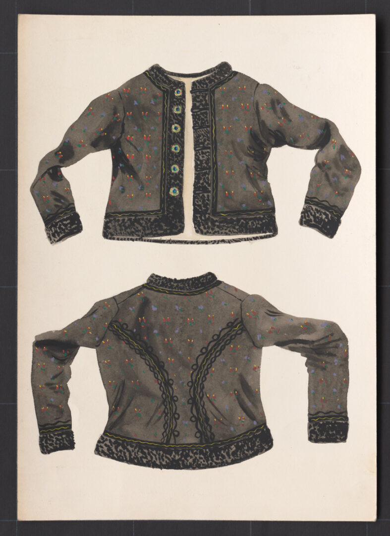 Ženský kabátik, Šarišské Sokolovce, prvá polovica 20. storočia. Kabátik (báršoňova huňka) je ušitý z drobno vyšívaného čierneho zamatu (báršoňu) a podšitý teplým bielym flanelom. Má rovný strih, siaha niže pása. Okraje kabátika a rukávov lemuje pás imitácie čiernej barančiny. Kabátik sa nosil v zimnom období, nahrádzal kožuch. Patril k sviatočným odevným súčiastkam.