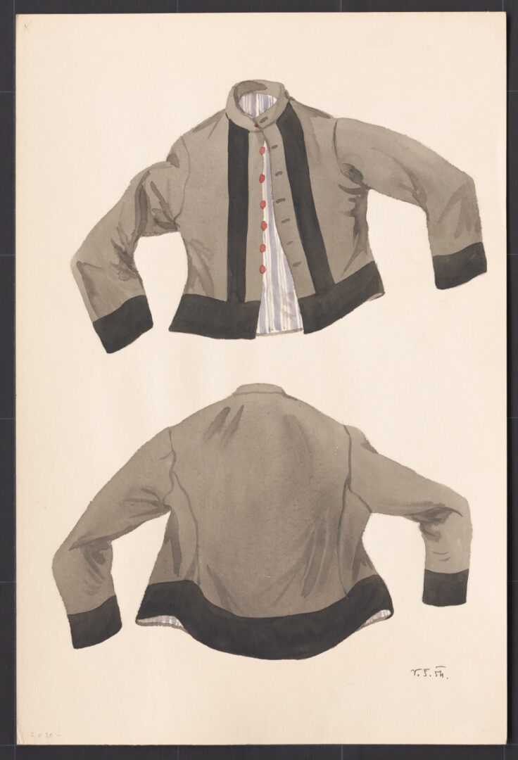 Ženský kabátik, Suchá Hora, prvá štvrtina 20. storočia. Kabátik (katana) je ušitý z jemného továrenského súkna a podšitý bielym flanelom s vatovaním. Strihaný je do pása, siaha do výšky bokov. Okraje zdobí širší pás čiernej zamatovej stuhy. Nosil sa v zime namiesto kožucha alebo kožušteka.