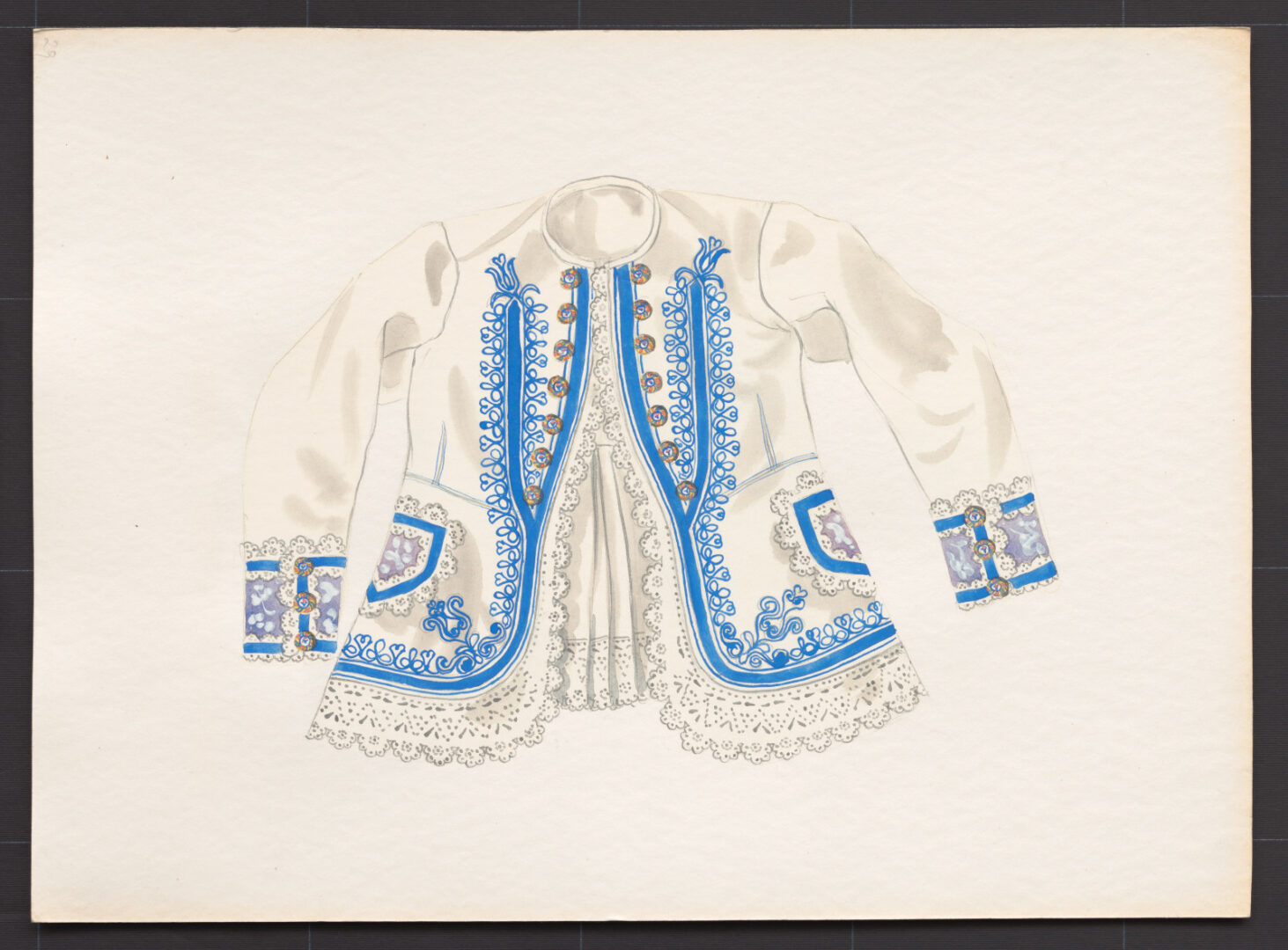 Ženský kabátik, Krakovany, začiatok 20. storočia. Kabátik (kacabaja) je ušitý z jemného bieleho súkna, podšitého bielym barchetom. Strihaný je do pása, siaha niže pása. Okraje kabátika a rukávov zdobí pás súkennej vysekávanej čipky, doplnený o pás modrej harasovej stužky, a slučky z úzkej modrej šnúrky. Ženské kabátiky sa šili aj z bieleho piketu-barchetu a neboli vždy bohato zdobené šnurovaním. Súkenné sa nosili v zimnom období, barchetové v chladných dňoch v letnom období. Nezdobené si obliekali buď staršie ženy, alebo vo všedné dni slobodné dievčatá a mladé ženy. Šnurované kabátiky boli určené len pre slobodné dievčatá a mladé ženy na veľké sviatky.