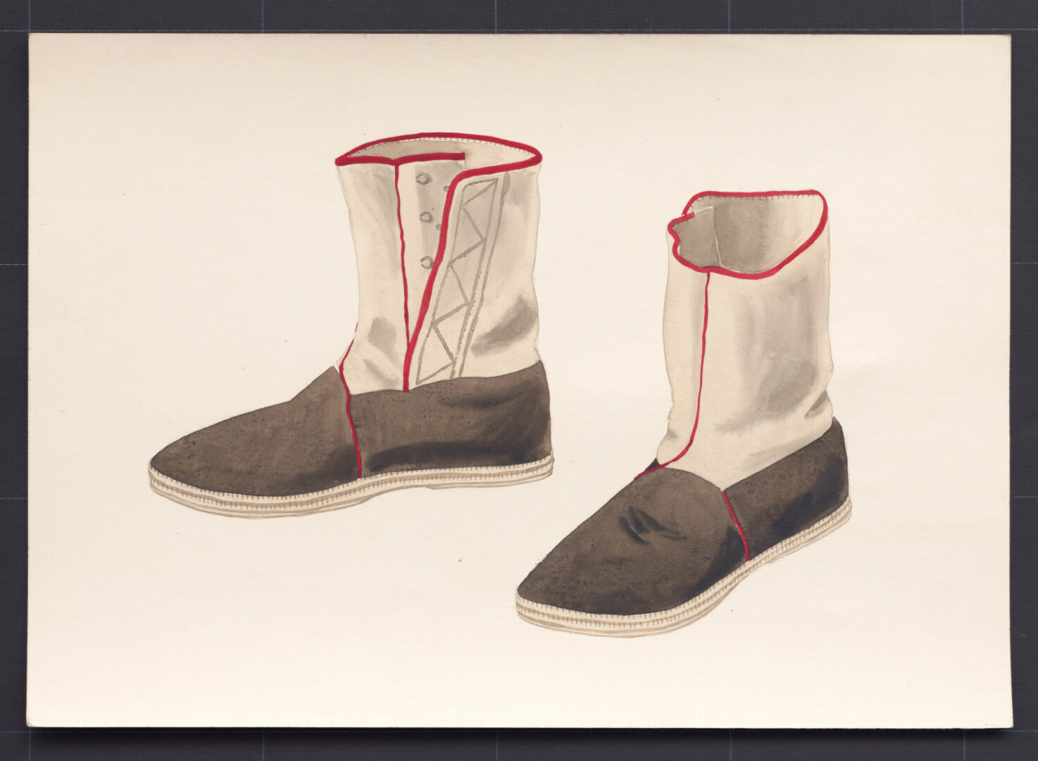 Mužské papuče, Záriečie, začiatok 20. storočia. Papuče sú ušité z tmavého a bieleho domáceho súkna. Podošva je zhotovená z viacerých vrstiev súkna, prešitých hrubou konopnou niťou. Lemovanie papúč je z jemného červeného súkna. Rozparok na vnútornej strane nízkych sár sa zapínal na tri páry kovových háčikov. Muži nosili papuče najmä v suchej zime. V lete si ich obuli namiesto krpcov len v nedeľu, keď išli kostola.