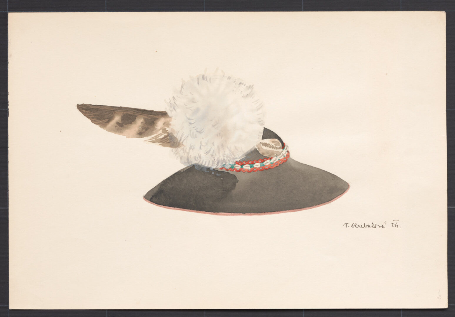 Klobúk, Suchá Hora, prvá polovica 20. storočia. Klobúk (kaňak) je zhotovený z čiernej plsti. Má oblé dienko a širšiu, mierne sklopenú striešku. Zdobí ho pásik červenej vybíjanej kože, na ktorej sú prišité drobné biele mušličky kauri (kostky). Výzdobu dopĺňa pero (pjuro) z krídla orla, chumáč bieleho páperia z moriaka a veľká morská mušľa, čo mali na klobúku len mládenci. Pero sa pripínalo na tú stranu klobúka, z ktorého krídla bolo. Klobúky sa zvyčajne kupovali v Poľsku.