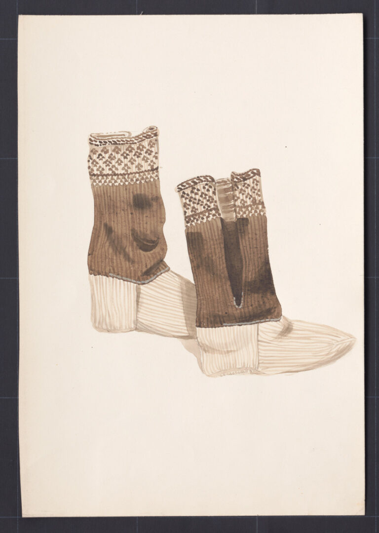 Mužské kopytcia, Omšenie, prvá štvrtina 20. storočia. Kopytcia (pančuchy) sú upletené z druganej tmavej a bielej ovčej vlny. Vlnu drugali a kopytcia plietli muži. Kopytcia sa obúvali buď do súkenných papúč, alebo do kožených krpcov. V lete sa nosili len vo sviatočné dni, pri návšteve kostola. V zime sa obúvali vo všedné i sviatočné dni. Mužské kopytcia boli vždy z tmavej vlny a na vnútornej strane mali rozparok. Ženské pančuchy boli biele a rozparok im chýbal.