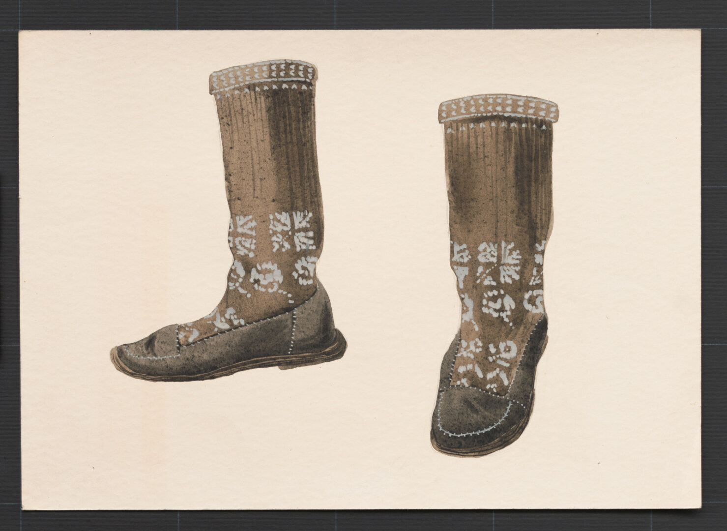 Ženské papuče, Detva, druhá štvrtina 20. storočia. Papuče (pletené kapce) sú upletené z doma druganej vlny prírodnej čiernej (buravej) farby, s bielym vypleteným vzorom. Majú vysokú sáru, ktorá siaha takmer pod koleno. Špička a okraje chodidla sú obšité hrubším továrenským súknom, z ktorého je aj podošva. Podošvu tvoria štyri vrstvy súkna, prešité hrubším špagátom. Papuče plietli na piatich ihliciach muži. Nosili sa naboso. Boli obuvou najmä v zimnom období, len staré ženy ich nosili aj v lete.