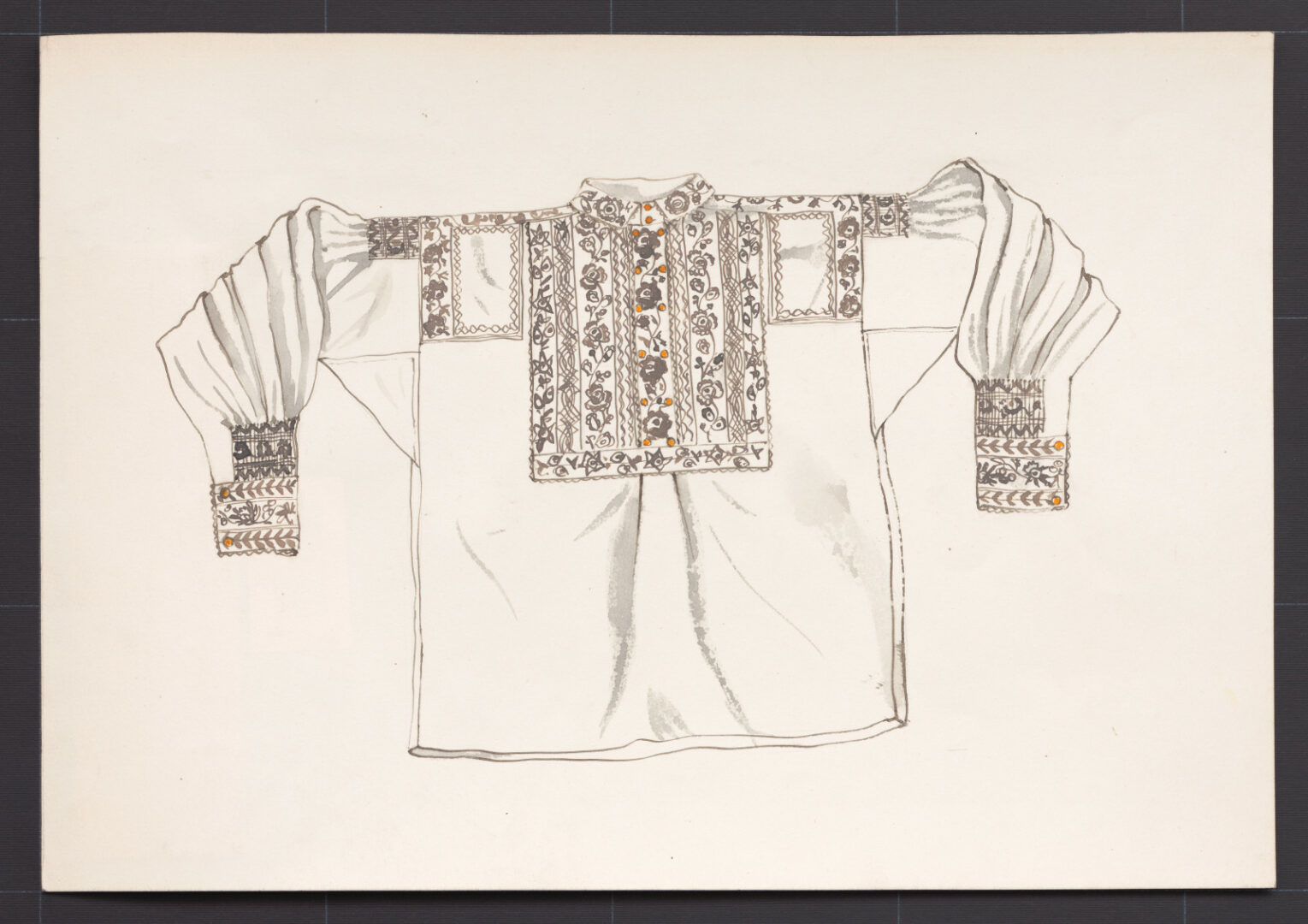 Mužská košeľa, Dobrá Niva, druhá štvrtina 20. storočia. Košeľa je ušitá z bavlneného plátna. Má rovný strih so širokými rukávmi, ktoré sú ku košeli prišité kolmo a všité do manžiet. Košeľa má úzky preložený golier a zapína sa na tri veľké spínacie gombíky (patenty), našité drobné sklenené gombičky slúžia iba na ozdobu. Zdobená je kombináciou výšivky a strojového štepovania čiernou niťou. Čierna výšivka bola určená slobodným mládencom a mladým mužom. Starší muži mali košele vyšívané v hnedej farbe. Začiatkom 20. storočia sa košele vyšívali len krížikovou výšivkou.