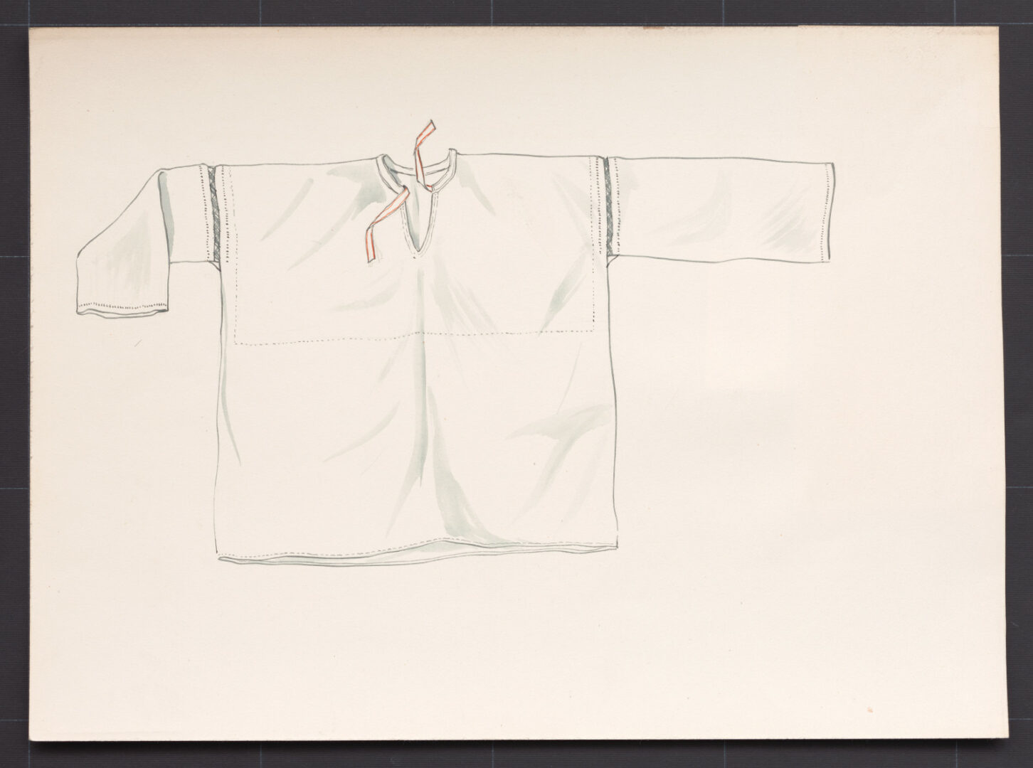 Mužská košeľa, Horný Vadičov, prvá štvrtina 20. storočia. Košeľa rovného strihu je ušitá z tenšieho bieleného ľanového plátna. Rukávy sú k nej prišité ozdobnou mriežkou. Košeľa patrila k sviatočnému odevu. Vo všedné dni sa nosila košeľa z hrubšieho ľanového plátna. Pod hrdlom sa uväzovala párom tkaníc. Muži mali tkanice biele, prípadne s úzkym červeným pásikom, mládenci mali tkanice farbisté. Podloženie pliec nebolo pri rozparku prišité a tak vytváralo ležaté vrecko, v ktorom sa nosili peniaze, ale aj meštek s tabakom a fajka. V priebehu druhej štvrtiny 20. storočia košeľu rovného strihu vystriedali košele mestského strihu z kupovaného bavlneného plátna. V tomto období si ľanové košele rovného strihu obliekali už len starší muži.