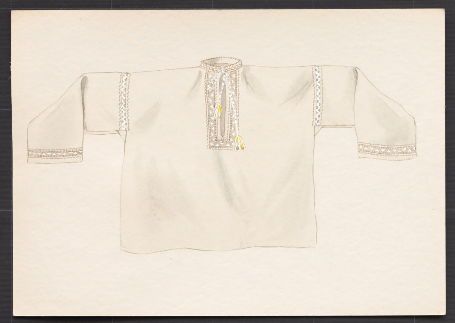Mužská košeľa na všedný deň, Čičmany, koniec 19. storočia. Košeľa je ušitá z domáceho hrubšieho ľanového plátna, rovného strihu, s nízkym stojatým golierom a s voľnými rukávmi. Okolo rozparku a na okrajoch rukávov je zdobená výšivkou z bielenej i zo zrebnej ľanovej priadze. Pri práci bola košeľa zakasaná do plátenných gatí alebo súkenných nohavíc. Len v horúce letné dni si muži košeľu vykasali.