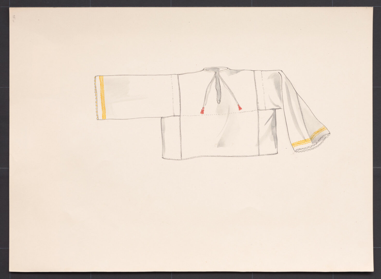Mužská košeľa, Bzovík, prvá štvrtina 20. storočia. Košeľa je ušitá z jemného kupovaného bavlneného plátna. Má rovný strih s rovnými, voľnými rukávmi, ktorých konce zdobí drobná výšivka a pásik čipky. Siaha do pása. Keďže v obci sa tkalo užšie plátno, bolo potrebné medzi predný a zadný diel drieku košele vložiť bočné diely. Sviatočné košele sa šili z najjemnejšieho ľanového alebo bavlneného plátna. Na všedné dni boli určené košele z hrubšieho konopného alebo ľanového plátna.