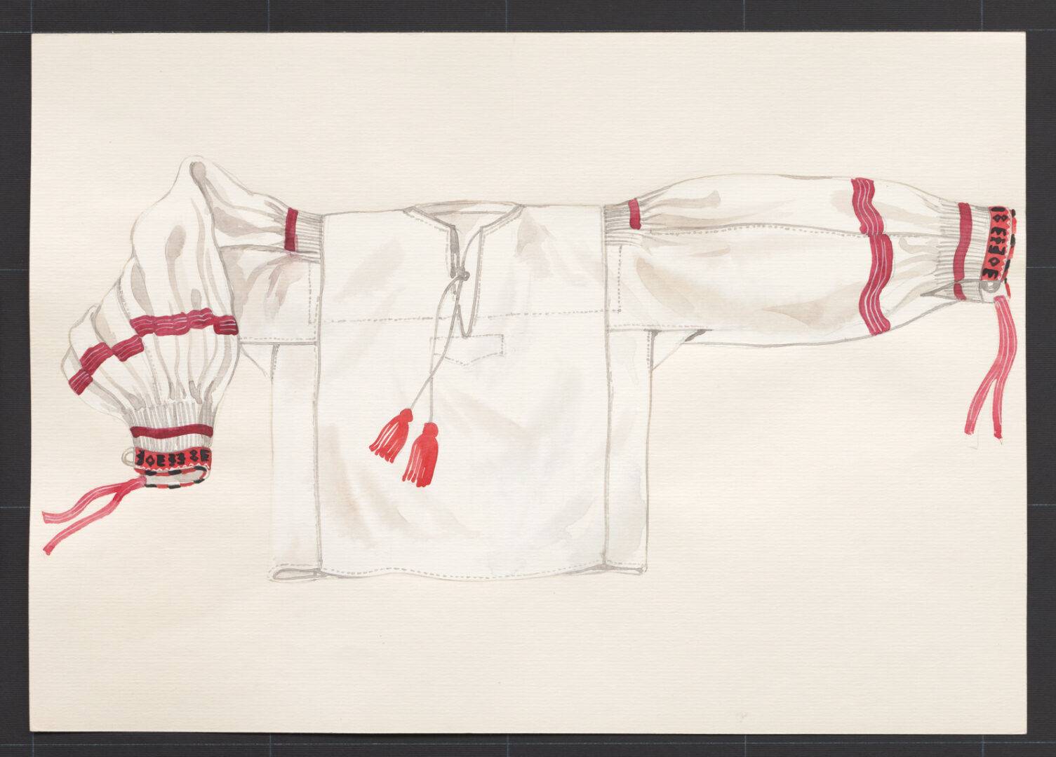Mužská košeľa, Žibritov, začiatok 20. storočia. Košeľa je ušitá z domáceho bavlneného plátna. Má rovný strih s rukávmi stiahnutými do úzkeho obalka. Siaha do pása. Bavlnená košeľa tvorila súčasť sviatočného odevu mužov. Na všedné dni bola určená košeľa z domáceho konopného plátna a bez farebného vytkávania. Keďže v obci sa tkalo úzke plátno, driek košele je doplnený o dva bočné diely a rukáv je ušitý z dvoch pôl plátna. Košeľa predstavuje novšiu formu mužskej košele, ktorá sa začala nosiť začiatkom 20. storočia. Vystriedala tak krátku košeľu, ktorá siahala len do pol hrude.