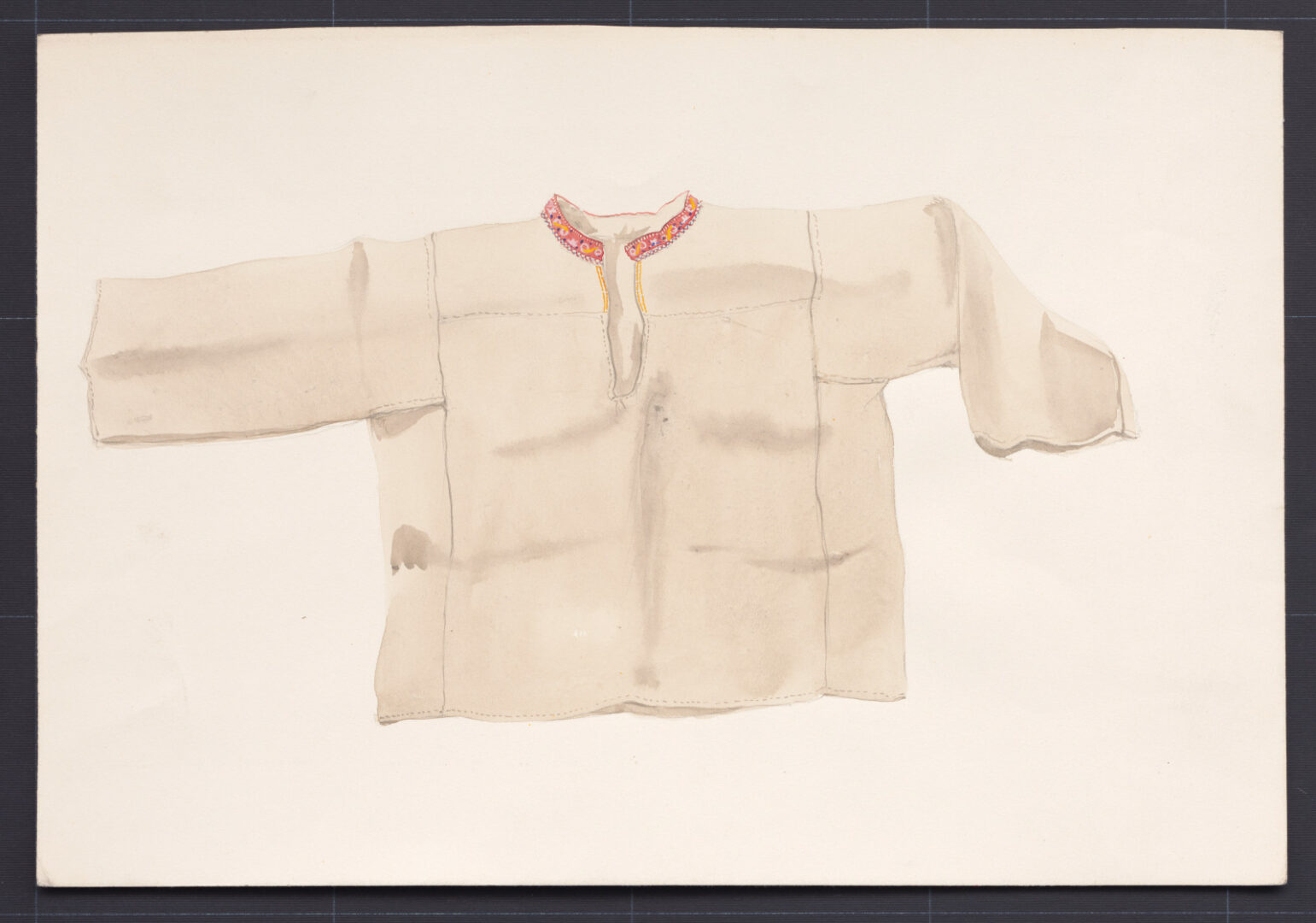 Mužská košeľa, Omšenie, prvá štvrtina 20. storočia. Košeľa je ušitá z hrubšieho domáceho konopného plátna. Má rovný strih s rovnými, voľnými rukávmi. Keďže na zhotovenie košele sa použilo užšie plátno, bolo potrebné na bokoch vložiť ešte po pol pole plátna, aby sa košeľa dala pohodlne nosiť. Nízky stojatý golier zdobí výšivka v kombinácii červenej, bielej a čiernej farby. Košeľa tvorila súčasť všedného oblečenia. Farebnosť výšivky dokladá, že bola určená pre slobodného mládenca alebo mladšieho muža. Starší muži mali goliere košieľ vyšívané v rôznych odtieňoch žltej a v čiernej farbe.