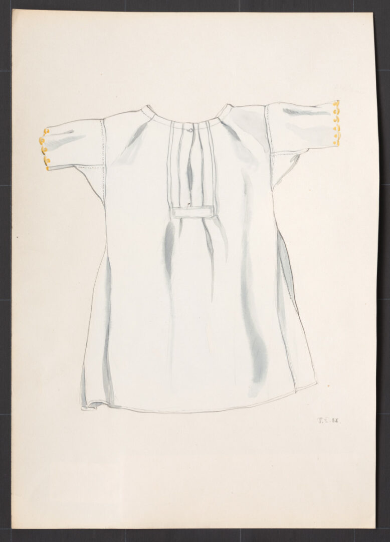 Ženská košeľa, Lazisko, druhá štvrtina 20. storočia. Košeľa je ušitá z kupovaného bavlneného plátna, má rovný strih s klinovitým rozšírením spodného okraja a krátke rukávy prišité kolmo. Siaha pod kolená. Začiatkom 20. storočia takéto košele postupne nahradili košeľu s rukávmi prišitými bokom.