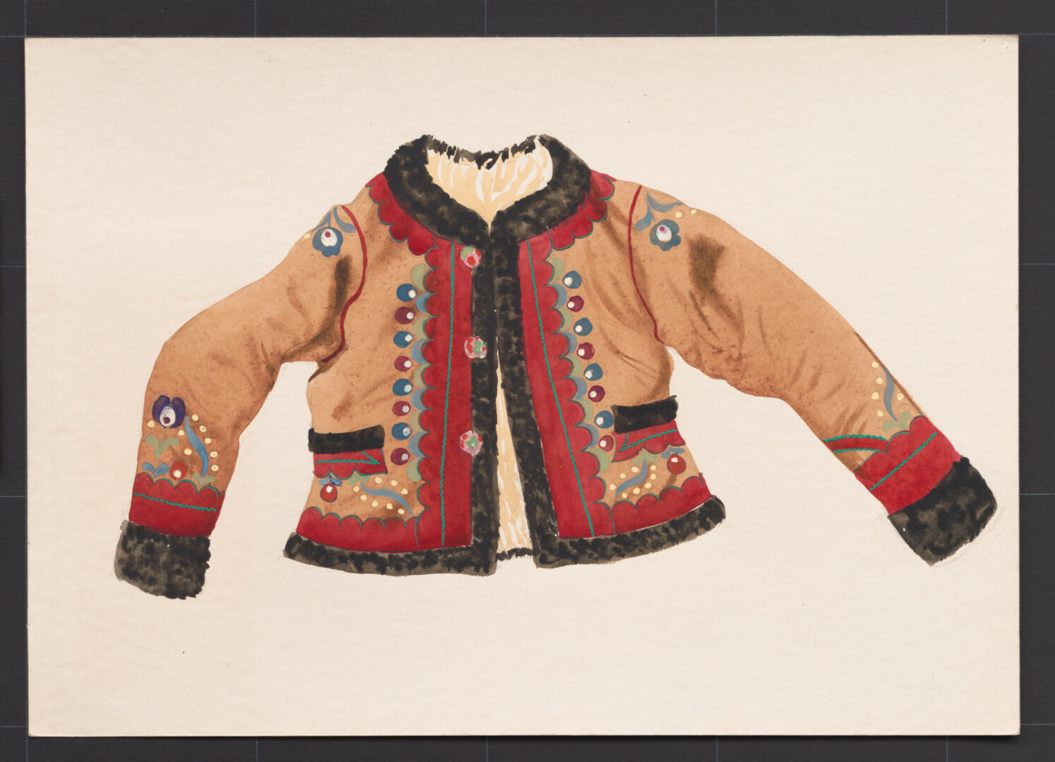 Ženský kožuch, Detva, začiatok 20. storočia. Kožuch je zhotovený z hnedej ovčej kožušiny. Strihaný je mierne do pása a siahal po boky. Okraje sú lemované užším pásom čiernej barančiny, ktorá je po okraji kožucha, rukávov i vreciek doplnená pásom oblúkovito vykrojenej červenej irchy. Úzke pásiky červenej irchy sú tiež vložené do všetkých švíkov. Výzdobu kožucha tvorí pestrofarebná hodvábna výšivka motívov kvietkov a lístkov, ktorá je sústredená najmä na chrbte kožucha. Nový a neobnosený kožuch sa nosil vo sviatočné dni v zime. Obnosený a starý sa obliekal aj vo všedné dni. Kožuch nevlastnili všetky ženy. Mohli si ho dať ušiť len ženy bohatých gazdov.