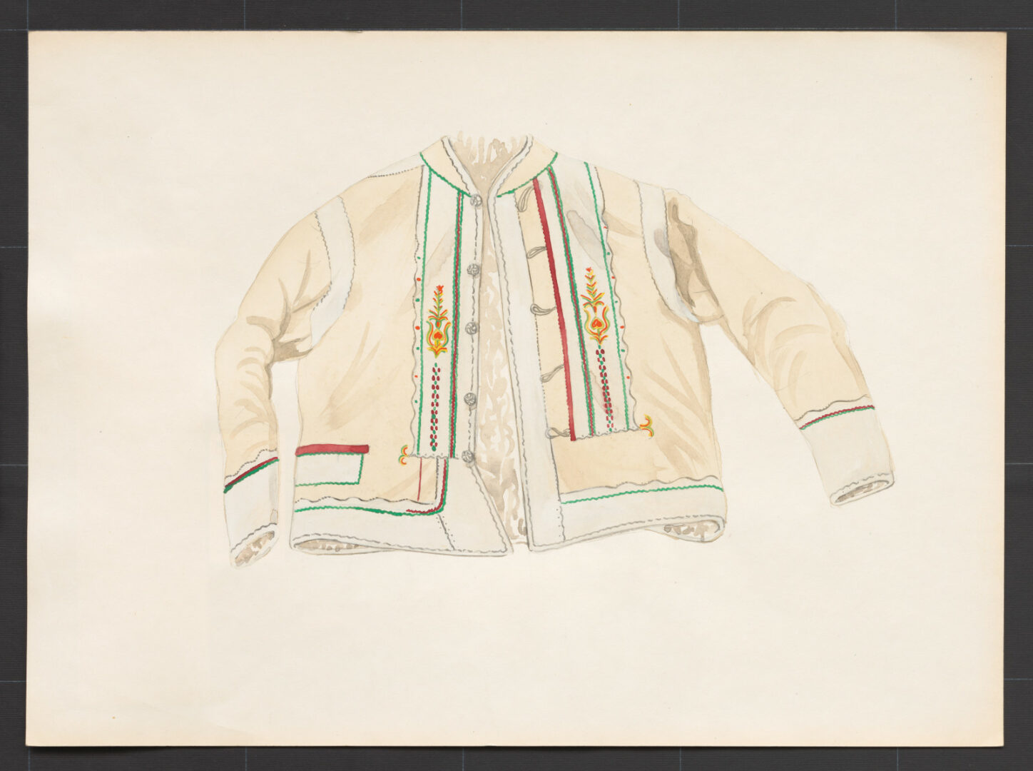 Kožuch, Zázrivá, začiatok 20. storočia. Kožuch (rukávny kožuch) je ušitý z bielej ovčej kožušiny. Má rovný strih, siaha niečo niže pása. Okraje kožucha, rukávov a švíky zdobia široké pásy bielej irchy, doplnené farebnou výšivkou. Kožuch nosili ženy v zime vo všedné i sviatočné dni. Vo všedné dni to bol starší, obnosený a vo sviatočné dni nový, málo nosený kožuch. Kožuchy šil miestny kožušník na objednávku. Ženský kožuch mal rovnaký strih ako mužský, rozdiel bol len v tom, že mužský kožuch nebol zdobený výšivkou.