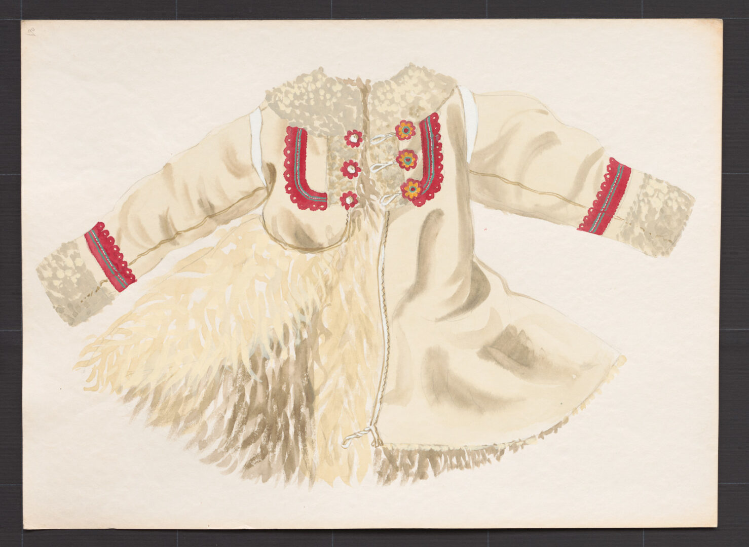 Ženský dlhý kožuch, Krakovany, začiatok 20. storočia. Kožuch (belák) je ušitý z bielej ovčej kožušiny, strihaný je do pása, siaha niže pása. Okraje kožucha a rukávov lemuje široký pás bielej barančiny. Výzdoba z červenej irchy a z farebnej hodvábnej výšivky je sústredená najmä na chrbte, pozdĺž zapínania a okrajov rukávov. Cípy predných dielov kožucha sa pri chôdzi vypínali dozadu. Kožuch v minulosti vlastnila takmer každá žena v obci. Kupovali si ho na jarmoku.