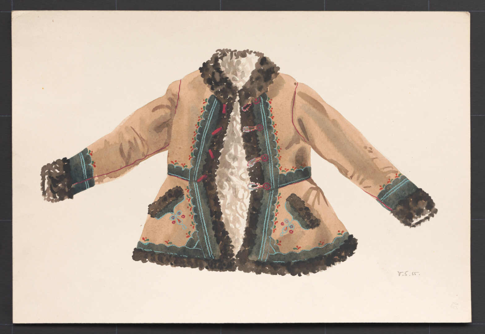 Ženský kožuch, Rejdová, prvá štvrtina 20. storočia. Kožuch (žoutý kožuch) je ušitý z hnedej ovčej kožušiny. Strihaný je do pása, s dvoma väčšími šosíkmi na zadnom diele. Okraje kožucha a rukávov lemuje širší pás čiernej barančiny, doplnený o pás tmavozelenej irchy. Pásy irchy dopĺňa drobná hodvábna výšivka, ktorá má na zadnom diele podobu jednoduchej štylizovanej kytice. Kožuch bol súčasťou vrchného odevu v zimnom období. Pre veľké šosíky ho tiež nazývali kožuch s fodrou alebo kakadou.