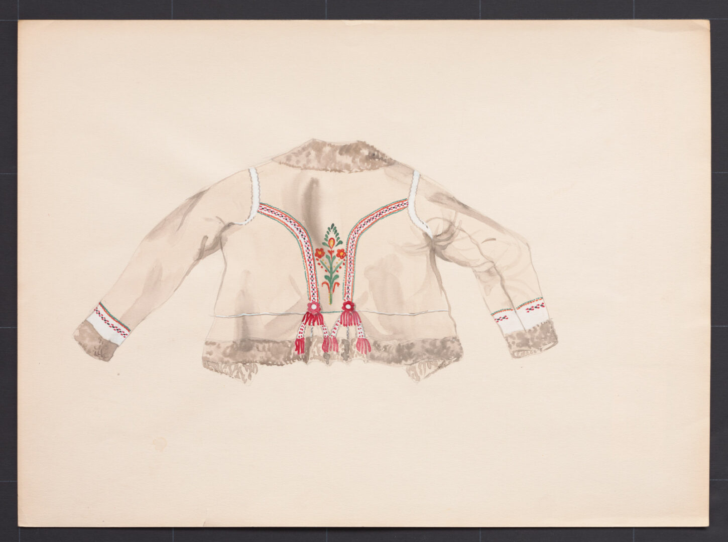 Krátky ženský kožuch, Kojšov, začiatok 20. storočia. Kožuch je ušitý z bielej ovčej kožušiny. Okraje kožucha a rukávov lemuje pás bielej barančiny. Výzdobu tvoria pásy červenej a bielej irchy pozdĺž zapínania a pestrofarebná výšivka na chrbtovom diele. Pásy bielej irchy doplnené o červené a zelené prepletanie lemujú aj švíky. Výzdoba kožucha, najmä výšivka, naznačuje, že kožuch bol určený pre mladšiu ženu.