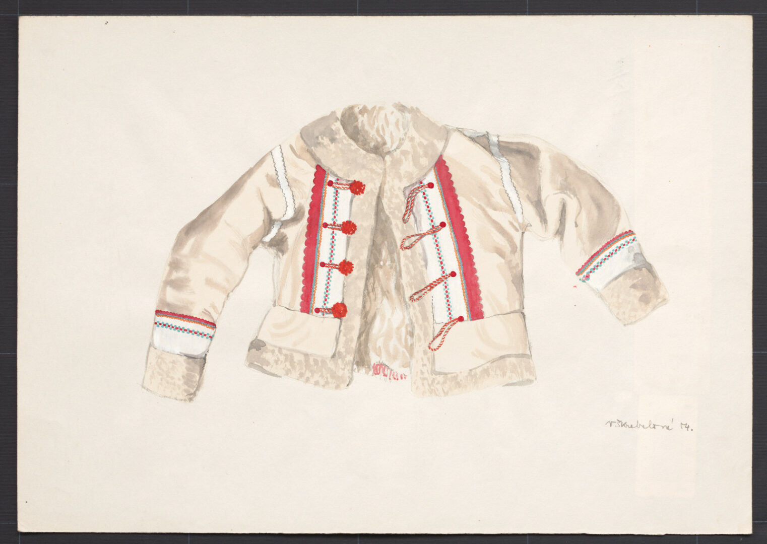 Krátky ženský kožuch, Kojšov, začiatok 20. storočia. Kožuch je ušitý z bielej ovčej kožušiny. Okraje kožucha a rukávov lemuje pás bielej barančiny. Výzdobu tvoria pásy červenej a bielej irchy pozdĺž zapínania. Pásy bielej irchy lemujú aj švíky. Striedmosť výzdoby naznačuje, že kožuch bol určený pre staršiu ženu.