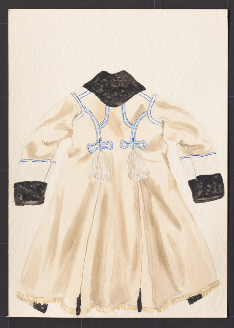Ženský kožuch, Studienka, koniec 19. storočia. Kožuch je ušitý z bielej ovčej kožušiny. Strihaný je do pása, siaha takmer po kolená. Pri chôdzi sa predné cípy vypínali dozadu. Všetky švíky sú prekryté pásikmi bielej irchy, prišitej modrou niťou. Krčný výstrih, zapínanie a okraje rukávov lemuje široký pás čiernej barančiny, doplnený rovnako širokým pásom bielej irchy. Kožuch bol nákladnou sviatočnou odevnou súčiastkou, ktorú vlastnili len ženy bohatých gazdov. Niektoré ženy mali dokonca dva kožuchy – jeden dostala nevesta, keď sa vydávala, a druhý zdedila po smrti svojej matky. Chudobnejšie ženy nosili v zime len látkové kabátiky, kacabajky.