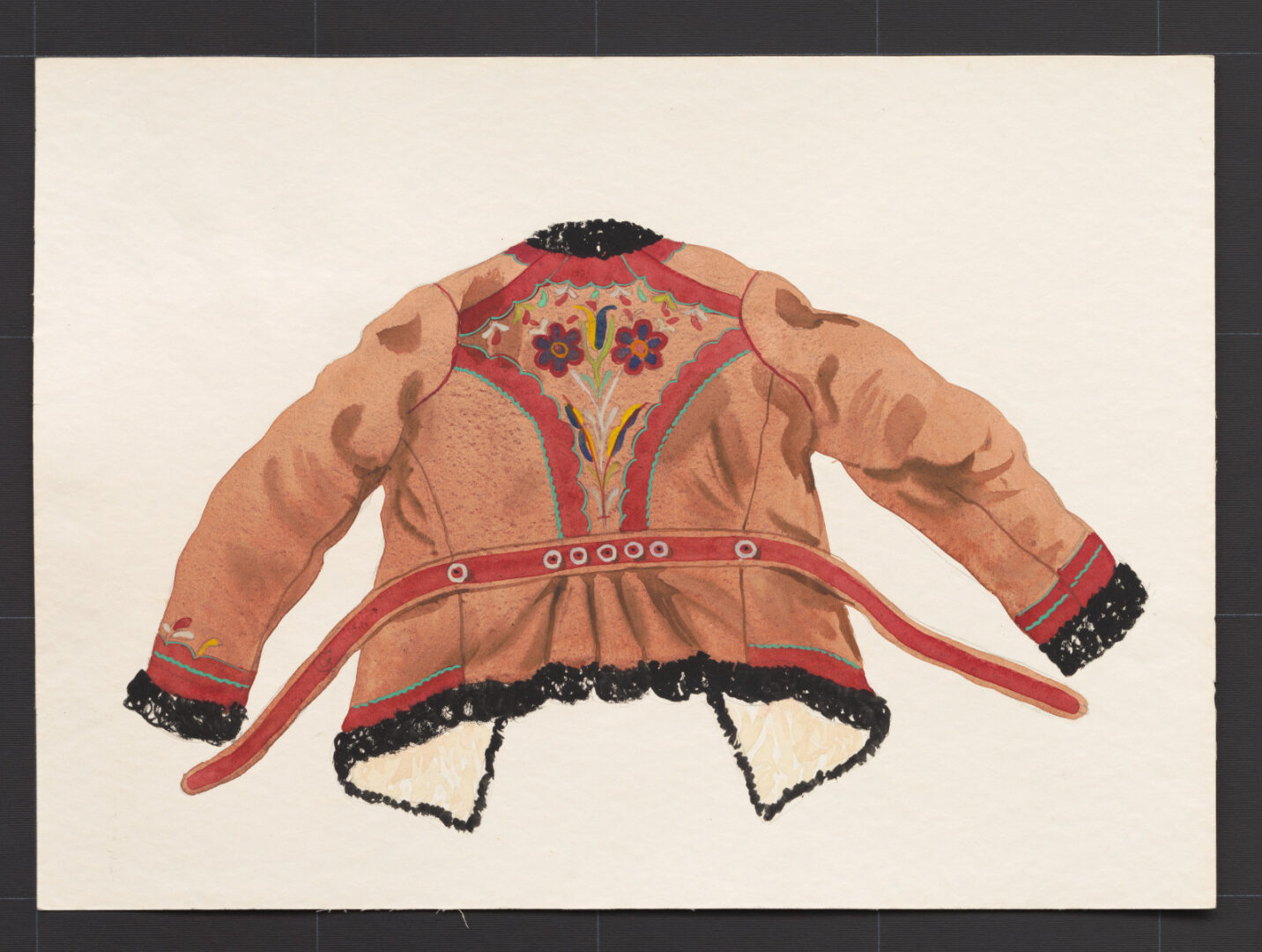 Ženský kožuch, Čierny Balog, začiatok 20. storočia. Kožuch je ušitý z nahnedo zafarbenej ovčej kožušiny. Zapína sa na niekoľko kovových háčikov. Navyše má vzadu vo výške pása pripevnený opasok, ktorý sa namiesto pracky zapína na kovový háčik a dierky. Okraje kožucha a rukávov sú lemované pásom čiernej barančiny a červenej irchy, doplnenej zeleným sirmovaním a drobnou výšivkou. Výzdobu kožucha na chrbtovom diele tvorí hodvábom vyšívaný motív kytice a širšie pásiky červenej irchy, ktorými si prekryté chrbtové švíky. Kožuch siahal niže pása.