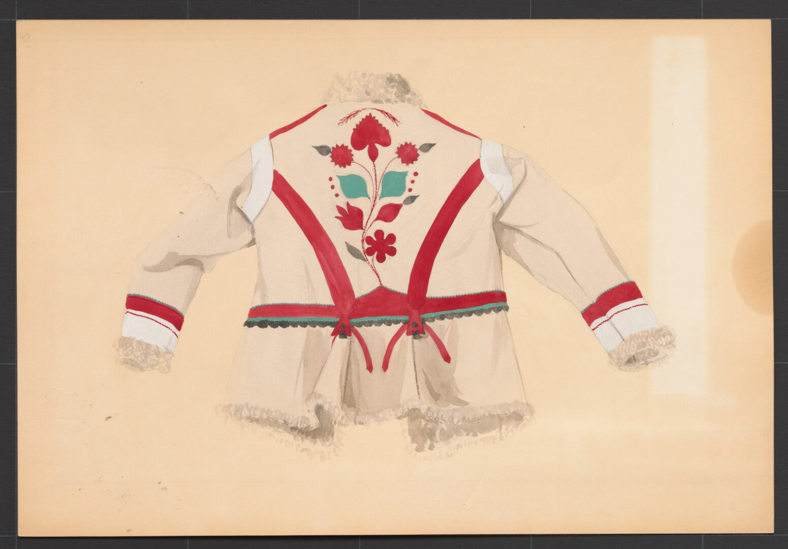 Ženský kožuch. Druhá štvrtina 20. storočia. Pohľad zozadu. Kožuch je ušitý z bielej ovčej kožušiny. Strihaný je do pása, siaha do výšky bokov. Krčný výstrih a rukávy má lemované pásom bielej barančiny. Na zadnom diele a rukávoch je zdobený motívom kytice zloženej zo štylizovaných kvetov a lístkov z farebnej irchy. Kožuchy tejto formy sa začali nosiť až začiatkom druhej štvrtiny 20. storočia. Vystriedali nosenie staršej formy kožuchov, kožuchov s krielami, ktoré boli dlhšie. Siahali niže bokov a ich predné cípy sa pri chôdzi vypínali dozadu. V polovici 20. storočia začali ženy nosiť hnedé kožuchy bez akejkoľvek výzdoby.
