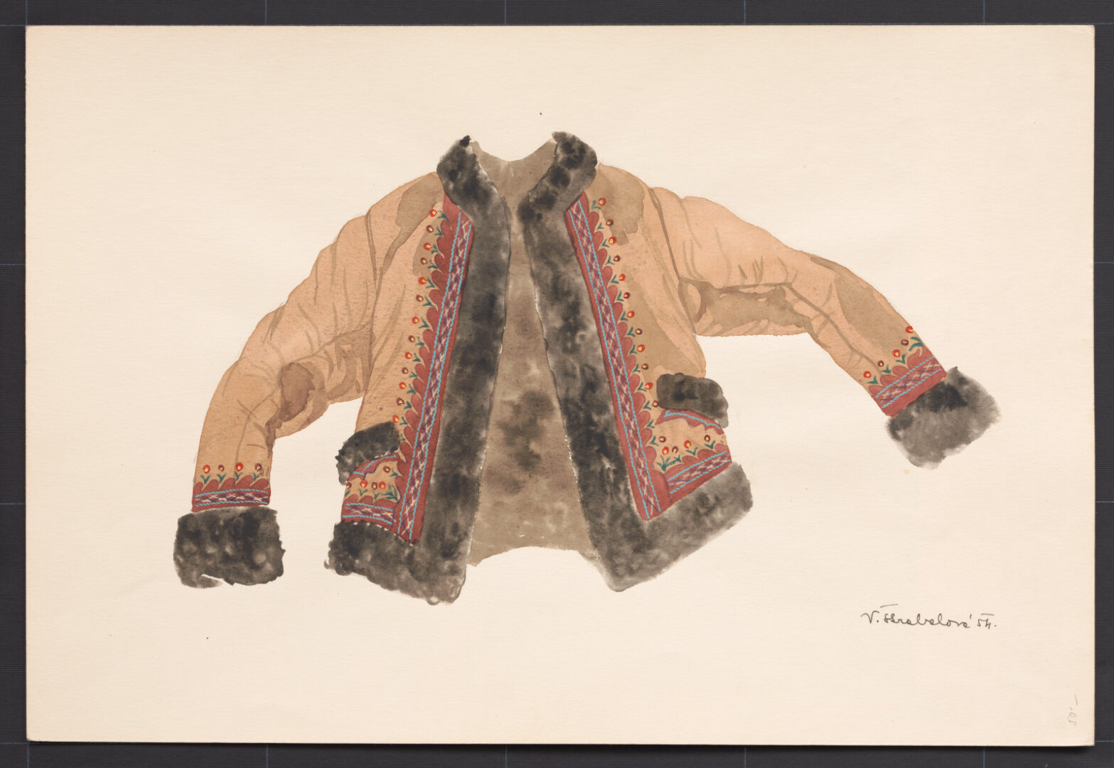 Ženský kožuch, Suchá Hora, druhá štvrtina 20. storočia. Kožuch je ušitý z hnedej ovčej kožušiny. Strihaný je do pása, siaha niečo niže pása. Okraje kožucha a rukávov lemuje pás čiernej barančiny. Švíky sú prekryté pásikmi červenej irchy, ktoré sú doplnené farebnou výšivkou. Kožuch bol súčasťou zimného vrchného sviatočného oblečenia. Bol nákladnou odevnou súčiastkou, preto ho nevlastnili všetky ženy. Zobrazený kožuch bol kúpený v Poľsku.