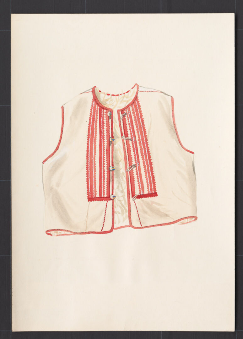 Mužský kožuštek, Vyšné Ružbachy, začiatok 20. storočia. Kožuštek (sedarček) je ušitý z bielej ovčej kožušiny. Má rovný strih. Okraje sú obrúbené pásikom červenej irchy. Pásiky červenej a bielej irchy sú našité aj pozdĺž zapínania. Chrbát zdobí kytica veľkých kvetov a lístkov, ktoré sú tiež aplikované z červenej irchy. Kožušteky sa nosili v zime pod súkenné kabanice (huňky).