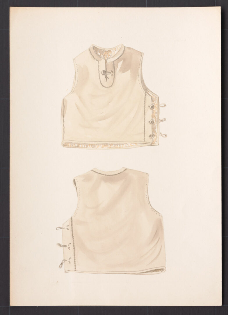 Mužský kožuštek, Vyšné Raslavice, začiatok 20. storočia. Kožuštek (brušlik) je ušitý z bielej ovčej kožušiny, bez výzdoby, so zapínaním na ľavom boku. Nosil sa v zime. Ak mal muž oblečený kožuštek, tak si ďalší krátky kožuch neobliekol do rukávov, ale len prehodil cez plecia.