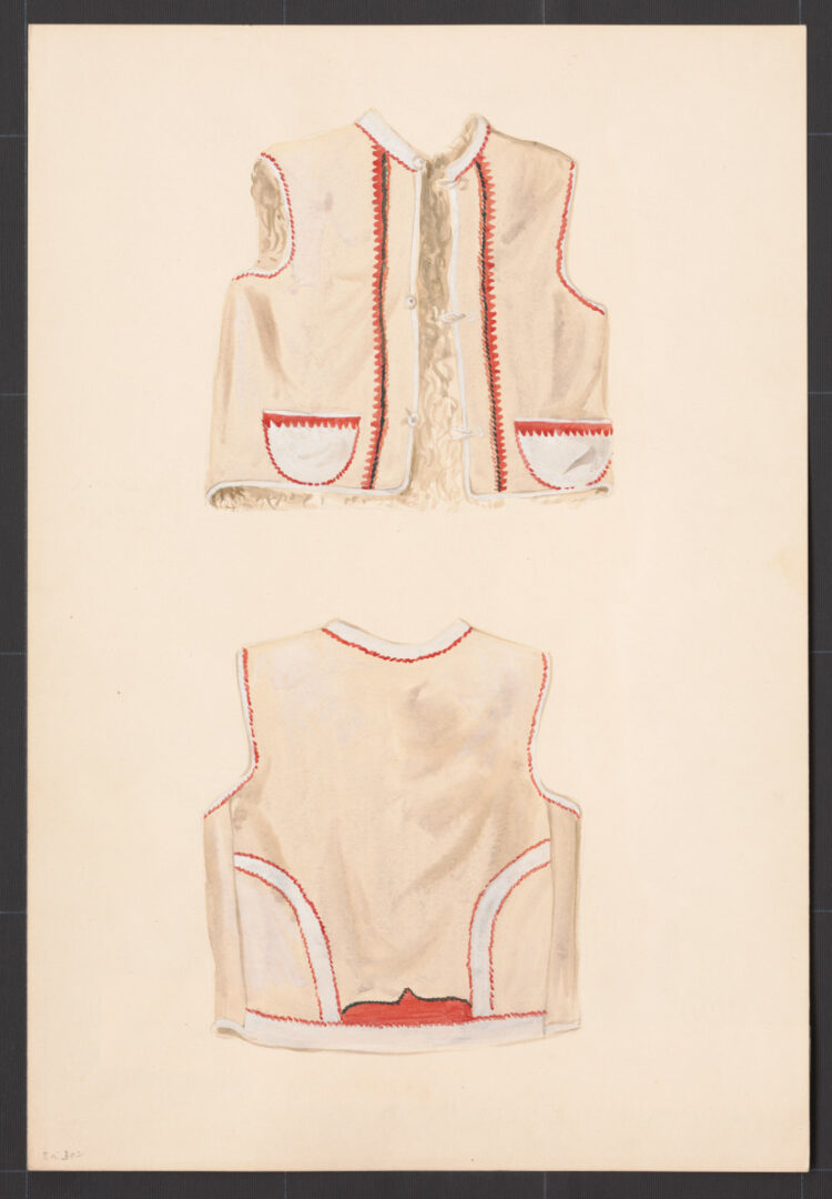 Mužský kožuštek. Prvá štvrtina 20. storočia. Kožuštek (serdak)je ušitý z bielej ovčej kožušiny. Má rovný strih, siaha do pása. Okraje lemuje úzky pásik bielej a červenej irchy. Kožuštek patril k odevným súčiastkam, ktoré sa nosili v zime. Nový sa nosil vo sviatočné a starší, obnosený vo všedné dni.