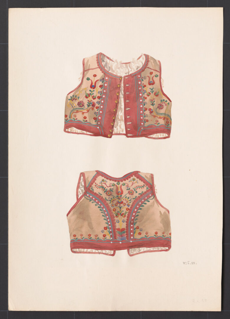 Ženský kožuštek, Rejdová, prvá štvrtina 20. storočia Kožuštek (žoutý kamizoľ) je ušitý z hnedej ovčej kožušiny. Má rovný strih, siaha do pása. Na predných dieloch a švíkoch ho zdobia pásy červenej irchy, vysekávanej na spôsob čipky. Zadný diel zdobí farebná výšivka veľkej štylizovanej kytice kvetov. Kožuštek sa nosil v zime pod kabátik (vizitku). V polovici 20. storočia sa postupne prestal nosiť.