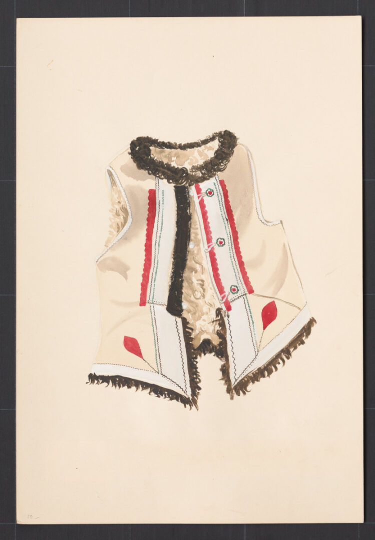 Ženský kožuštek, Bzovík, prvá polovica 20. storočia. Kožuštek je ušitý z bielej ovčej kožušiny. Má rovný strih. Okraje lemuje úzky pásik čiernej ovčej kožušiny a široké pásy bielej irchy. Výzdobu dopĺňajú úzke pásiky červenej irchy. V chladných jarných a jesenných dňoch sa kožuštek obliekal na rukávce, v zime na kabátik. Kožušteky šil na objednávku kožušník v Krupine.