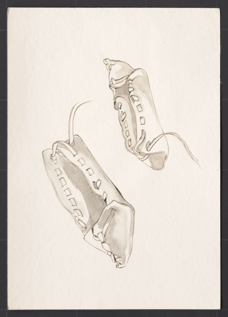 Mužské krpce, Skýcov, začiatok 20. storočia. Krpce sú zhotovené z jedneho kusa hrubšej hovädzej kože. Zošité sú pomocou tenkého remienka odrezaného z okraja kože. Zvlášť sa šil krpec na ľavú a zvlášť na pravú nohu. K nohe sa krpce upevňovali koženými návlakmi – úzkymi remienkami. Nosili sa počas celého roka, najmä vo všedné dni. V lete sa do krpcov obúvali plátenné onuce a v zime vlnené kopytcia. Sviatočnou obuvou mužov boli čižmy. Charakteristickým znakom mužských čižiem bolo srdcovité vykrojenie horného okraja sáry.