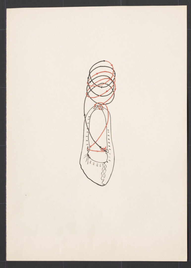 Krpce, Lazisko, začiatok 20. storočia. Schéma viazania návlakov – dlhých úzkych remienkov, ktorými sa krpce upevňovali na nohu. Medzi viazaním mužských a ženských krpcov nebol rozdiel.