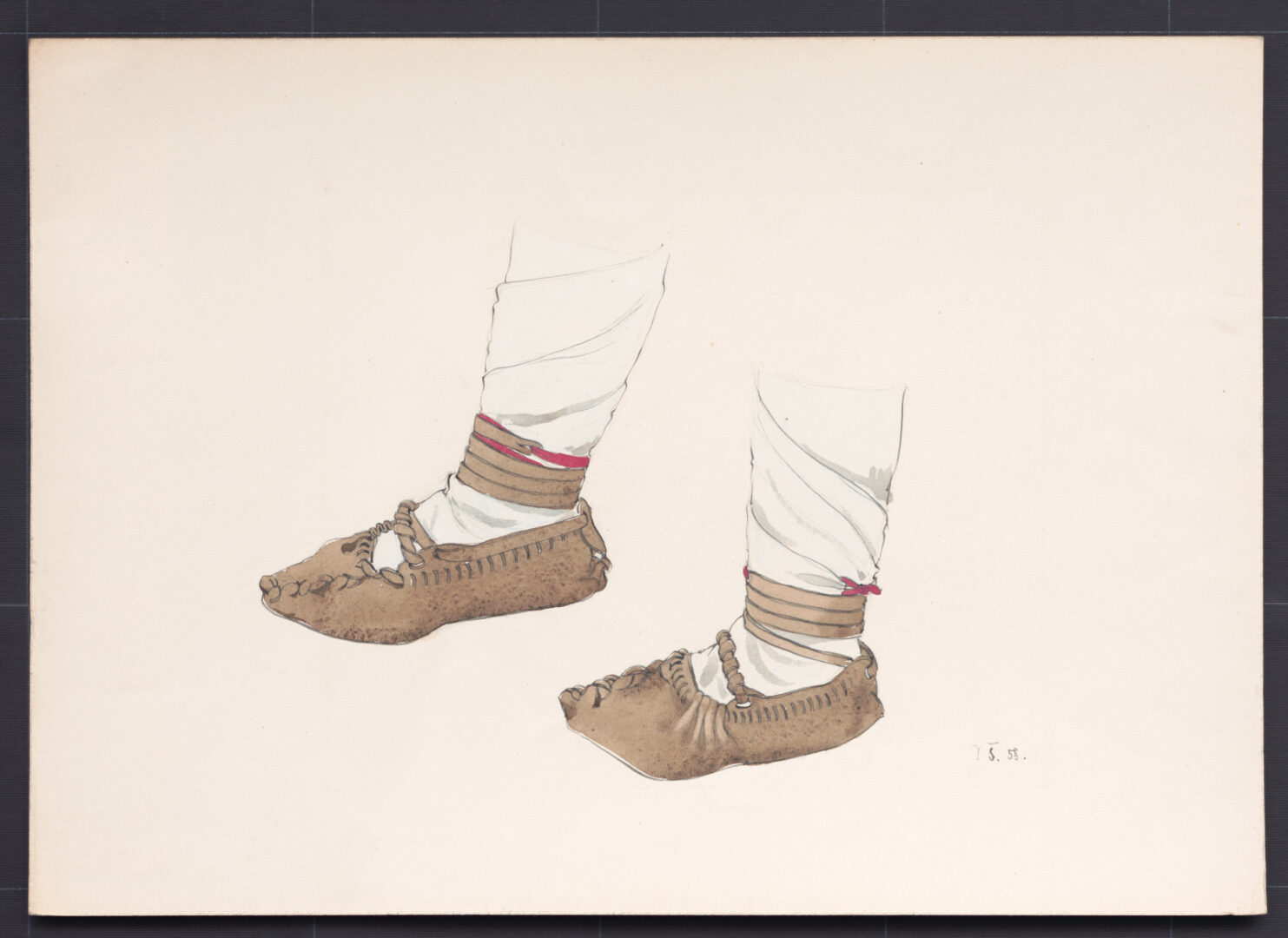 Ženské krpce, Terchová, začiatok 20. storočia. Spôsob obutia krpcov v jarnom a jesennom období. Do krpcov sa obúvali tri druhy plátenných onuciek – šatenka, omotka a pokrutka.Šatenkou sa najskôr omotalo chodidlo a priehlavok vyše členka. Potom sa na nohu omotala omotka. Na záver sa noha omotala ešte pokrutkou. Na nohu v onuckách sa navliekol krpec a upevnil sa koženým návlakom. V zime sa krpce upevňovali vlnenými návlakmi.