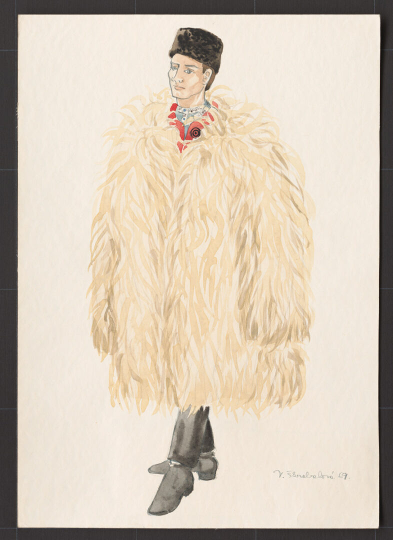 Vrchný odev muža v zimnom období, Sečovská Polianka, začiatok 20. storočia. Muž má pod gubou oblečenú bielu bavlnenú košeľu, spodné konopné gate, vrchné nohavice a kabátik z bieleho bavlneného kepra. Obuté má čižmy s tvrdými sárami. Na hlave má kožušinovú čiapku, baranicu. Guba je vrchný odev zhotovený z rovnomennej vlnenej tkaniny s dlhým vlasom na povrchu. Má jednoduchý rovný strih s priečnym švíkom na hrudi. Mohla byť rôzne dlhá a nosila sa len prehodená cez plecia. Takto oblečení bývali muži vo sviatočné dni v najtuhšej zime.