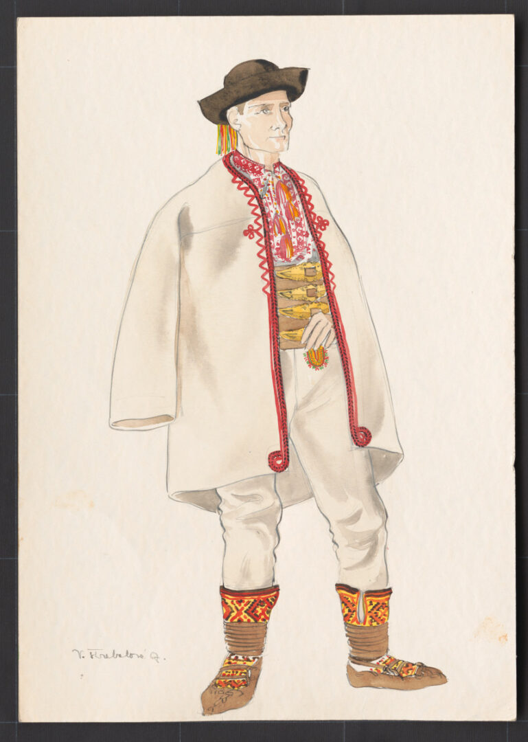 Sviatočný odev mladého muža v zimnom období, Čičmany, začiatok 20. storočia. Muž má oblečenú košeľu, súkenné nohavice so širokým koženým opaskom a cez plecia má prehodenú huňu. Na hlave má klobúk a na nohách kožené krpce s vlnenými kopytciami. O sviatočnom charaktere odevu svedčí rozsiahlosť výšivky na košeli a široký opasok. Na mladého muža poukazuje červená farba výšivky. Starší muži mali na košeliach bielo-oranžovú alebo žltú výšivku. O zimnom charaktere odevu svedčia súkenné nohavice a huňa, ktoré sa nosili najmä v zimnom období.
